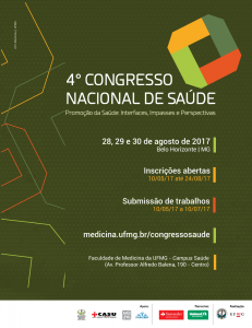 Estão abertas as inscrições para submissão de trabalhos e participação como ouvintes no 4º Congresso Nacional de Saúde, que será realizado do dia 28 a 30 de agosto de 2017. O Congresso é promovido pela Faculdade de Medicina da UFMG, e esta edição tem como tema “Promoção da Saúde: Interfaces, Impasses e Perspectivas”.